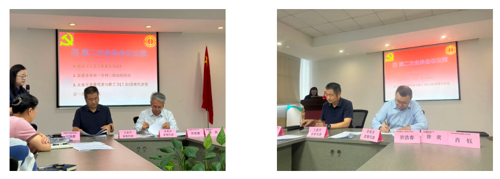 最后,大会进行了表决环节。经过审议和讨论,代表们一致通过了工会工作报告和集体合同及三个专项协议。随后,常州新祺晟高分子科技有限公司工会主席刘保群同志作为工会职工首席代表方,分别与常州新祺晟高分子科技有限公司总经理於浩春同志和常州昊天新材料科技有限公司总经理肖钰同志签订了相关协议。